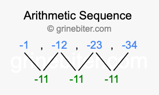 So, what type of sequence is -1, -12, -23, -34? The sequence -1, -12, -23, -34 has a common difference of -11 between each term. We call this kind of sequence an arithmetic sequence. Below is an image illustrating the correlation between the arithmetic sequence -1, -12, -23, -34 and its common difference of -11.