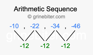 So, what type of sequence is -10, -22, -34, -46? The sequence -10, -22, -34, -46 has a common difference of -12 between each term. We call this kind of sequence an arithmetic sequence. Below is an image illustrating the correlation between the arithmetic sequence -10, -22, -34, -46 and its common difference of -12.