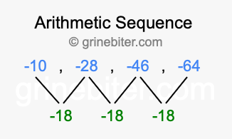So, what type of sequence is -10, -28, -46, -64? The sequence -10, -28, -46, -64 has a common difference of -18 between each term. We call this kind of sequence an arithmetic sequence. Below is an image illustrating the correlation between the arithmetic sequence -10, -28, -46, -64 and its common difference of -18.