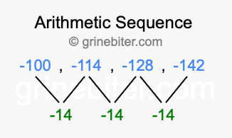So, what type of sequence is -100, -114, -128, -142? The sequence -100, -114, -128, -142 has a common difference of -14 between each term. We call this kind of sequence an arithmetic sequence. Below is an image illustrating the correlation between the arithmetic sequence -100, -114, -128, -142 and its common difference of -14.