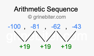 So, what type of sequence is -100, -81, -62, -43? The sequence -100, -81, -62, -43 has a common difference of +19 between each term. We call this kind of sequence an arithmetic sequence. Below is an image illustrating the correlation between the arithmetic sequence -100, -81, -62, -43 and its common difference of +19.