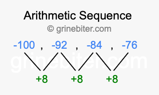 So, what type of sequence is -100, -92, -84, -76? The sequence -100, -92, -84, -76 has a common difference of +8 between each term. We call this kind of sequence an arithmetic sequence. Below is an image illustrating the correlation between the arithmetic sequence -100, -92, -84, -76 and its common difference of +8.