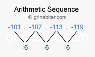 So, what type of sequence is -101, -107, -113, -119? The sequence -101, -107, -113, -119 has a common difference of -6 between each term. We call this kind of sequence an arithmetic sequence. Below is an image illustrating the correlation between the arithmetic sequence -101, -107, -113, -119 and its common difference of -6.