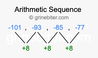 So, what type of sequence is -101, -93, -85, -77? The sequence -101, -93, -85, -77 has a common difference of +8 between each term. We call this kind of sequence an arithmetic sequence. Below is an image illustrating the correlation between the arithmetic sequence -101, -93, -85, -77 and its common difference of +8.