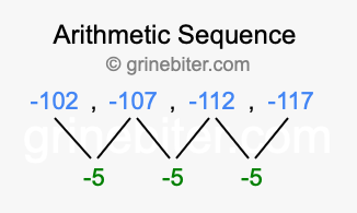So, what type of sequence is -102, -107, -112, -117? The sequence -102, -107, -112, -117 has a common difference of -5 between each term. We call this kind of sequence an arithmetic sequence. Below is an image illustrating the correlation between the arithmetic sequence -102, -107, -112, -117 and its common difference of -5.