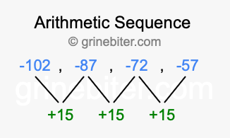 So, what type of sequence is -102, -87, -72, -57? The sequence -102, -87, -72, -57 has a common difference of +15 between each term. We call this kind of sequence an arithmetic sequence. Below is an image illustrating the correlation between the arithmetic sequence -102, -87, -72, -57 and its common difference of +15.