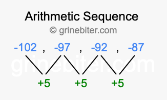 So, what type of sequence is -102, -97, -92, -87? The sequence -102, -97, -92, -87 has a common difference of +5 between each term. We call this kind of sequence an arithmetic sequence. Below is an image illustrating the correlation between the arithmetic sequence -102, -97, -92, -87 and its common difference of +5.