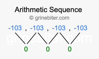 So, what type of sequence is -103, -103, -103, -103? The sequence -103, -103, -103, -103 has a common difference of 0 between each term. We call this kind of sequence an arithmetic sequence. Below is an image illustrating the correlation between the arithmetic sequence -103, -103, -103, -103 and its common difference of 0.