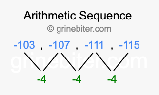 So, what type of sequence is -103, -107, -111, -115? The sequence -103, -107, -111, -115 has a common difference of -4 between each term. We call this kind of sequence an arithmetic sequence. Below is an image illustrating the correlation between the arithmetic sequence -103, -107, -111, -115 and its common difference of -4.
