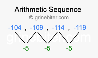 So, what type of sequence is -104, -109, -114, -119? The sequence -104, -109, -114, -119 has a common difference of -5 between each term. We call this kind of sequence an arithmetic sequence. Below is an image illustrating the correlation between the arithmetic sequence -104, -109, -114, -119 and its common difference of -5.