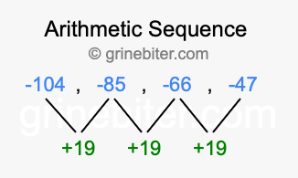 So, what type of sequence is -104, -85, -66, -47? The sequence -104, -85, -66, -47 has a common difference of +19 between each term. We call this kind of sequence an arithmetic sequence. Below is an image illustrating the correlation between the arithmetic sequence -104, -85, -66, -47 and its common difference of +19.