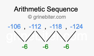 So, what type of sequence is -106, -112, -118, -124? The sequence -106, -112, -118, -124 has a common difference of -6 between each term. We call this kind of sequence an arithmetic sequence. Below is an image illustrating the correlation between the arithmetic sequence -106, -112, -118, -124 and its common difference of -6.