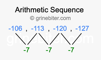 So, what type of sequence is -106, -113, -120, -127? The sequence -106, -113, -120, -127 has a common difference of -7 between each term. We call this kind of sequence an arithmetic sequence. Below is an image illustrating the correlation between the arithmetic sequence -106, -113, -120, -127 and its common difference of -7.