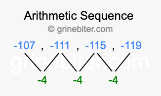 So, what type of sequence is -107, -111, -115, -119? The sequence -107, -111, -115, -119 has a common difference of -4 between each term. We call this kind of sequence an arithmetic sequence. Below is an image illustrating the correlation between the arithmetic sequence -107, -111, -115, -119 and its common difference of -4.