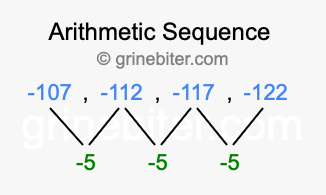 So, what type of sequence is -107, -112, -117, -122? The sequence -107, -112, -117, -122 has a common difference of -5 between each term. We call this kind of sequence an arithmetic sequence. Below is an image illustrating the correlation between the arithmetic sequence -107, -112, -117, -122 and its common difference of -5.