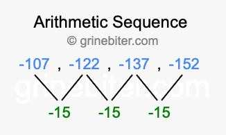 So, what type of sequence is -107, -122, -137, -152? The sequence -107, -122, -137, -152 has a common difference of -15 between each term. We call this kind of sequence an arithmetic sequence. Below is an image illustrating the correlation between the arithmetic sequence -107, -122, -137, -152 and its common difference of -15.