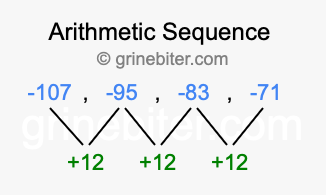 So, what type of sequence is -107, -95, -83, -71? The sequence -107, -95, -83, -71 has a common difference of +12 between each term. We call this kind of sequence an arithmetic sequence. Below is an image illustrating the correlation between the arithmetic sequence -107, -95, -83, -71 and its common difference of +12.