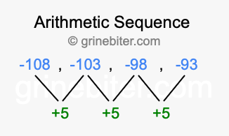 So, what type of sequence is -108, -103, -98, -93? The sequence -108, -103, -98, -93 has a common difference of +5 between each term. We call this kind of sequence an arithmetic sequence. Below is an image illustrating the correlation between the arithmetic sequence -108, -103, -98, -93 and its common difference of +5.