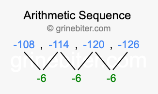 So, what type of sequence is -108, -114, -120, -126? The sequence -108, -114, -120, -126 has a common difference of -6 between each term. We call this kind of sequence an arithmetic sequence. Below is an image illustrating the correlation between the arithmetic sequence -108, -114, -120, -126 and its common difference of -6.