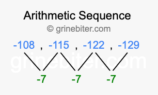 So, what type of sequence is -108, -115, -122, -129? The sequence -108, -115, -122, -129 has a common difference of -7 between each term. We call this kind of sequence an arithmetic sequence. Below is an image illustrating the correlation between the arithmetic sequence -108, -115, -122, -129 and its common difference of -7.