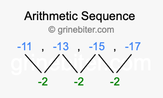 So, what type of sequence is -11, -13, -15, -17? The sequence -11, -13, -15, -17 has a common difference of -2 between each term. We call this kind of sequence an arithmetic sequence. Below is an image illustrating the correlation between the arithmetic sequence -11, -13, -15, -17 and its common difference of -2.