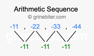 So, what type of sequence is -11, -22, -33, -44? The sequence -11, -22, -33, -44 has a common difference of -11 between each term. We call this kind of sequence an arithmetic sequence. Below is an image illustrating the correlation between the arithmetic sequence -11, -22, -33, -44 and its common difference of -11.