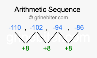 So, what type of sequence is -110, -102, -94, -86? The sequence -110, -102, -94, -86 has a common difference of +8 between each term. We call this kind of sequence an arithmetic sequence. Below is an image illustrating the correlation between the arithmetic sequence -110, -102, -94, -86 and its common difference of +8.