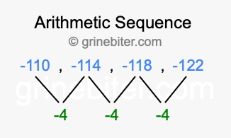 So, what type of sequence is -110, -114, -118, -122? The sequence -110, -114, -118, -122 has a common difference of -4 between each term. We call this kind of sequence an arithmetic sequence. Below is an image illustrating the correlation between the arithmetic sequence -110, -114, -118, -122 and its common difference of -4.