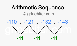 So, what type of sequence is -110, -121, -132, -143? The sequence -110, -121, -132, -143 has a common difference of -11 between each term. We call this kind of sequence an arithmetic sequence. Below is an image illustrating the correlation between the arithmetic sequence -110, -121, -132, -143 and its common difference of -11.