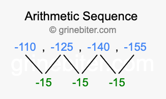 So, what type of sequence is -110, -125, -140, -155? The sequence -110, -125, -140, -155 has a common difference of -15 between each term. We call this kind of sequence an arithmetic sequence. Below is an image illustrating the correlation between the arithmetic sequence -110, -125, -140, -155 and its common difference of -15.