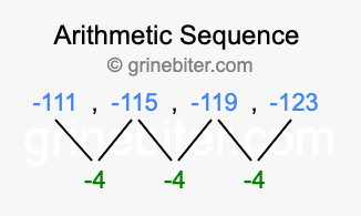 So, what type of sequence is -111, -115, -119, -123? The sequence -111, -115, -119, -123 has a common difference of -4 between each term. We call this kind of sequence an arithmetic sequence. Below is an image illustrating the correlation between the arithmetic sequence -111, -115, -119, -123 and its common difference of -4.