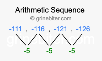 So, what type of sequence is -111, -116, -121, -126? The sequence -111, -116, -121, -126 has a common difference of -5 between each term. We call this kind of sequence an arithmetic sequence. Below is an image illustrating the correlation between the arithmetic sequence -111, -116, -121, -126 and its common difference of -5.