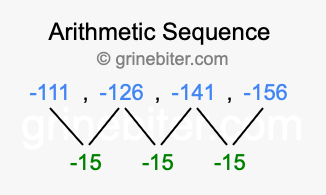 So, what type of sequence is -111, -126, -141, -156? The sequence -111, -126, -141, -156 has a common difference of -15 between each term. We call this kind of sequence an arithmetic sequence. Below is an image illustrating the correlation between the arithmetic sequence -111, -126, -141, -156 and its common difference of -15.