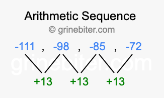 So, what type of sequence is -111, -98, -85, -72? The sequence -111, -98, -85, -72 has a common difference of +13 between each term. We call this kind of sequence an arithmetic sequence. Below is an image illustrating the correlation between the arithmetic sequence -111, -98, -85, -72 and its common difference of +13.