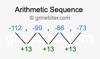 So, what type of sequence is -112, -99, -86, -73? The sequence -112, -99, -86, -73 has a common difference of +13 between each term. We call this kind of sequence an arithmetic sequence. Below is an image illustrating the correlation between the arithmetic sequence -112, -99, -86, -73 and its common difference of +13.