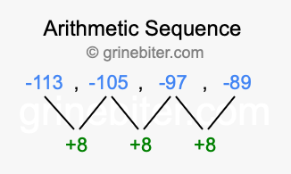 So, what type of sequence is -113, -105, -97, -89? The sequence -113, -105, -97, -89 has a common difference of +8 between each term. We call this kind of sequence an arithmetic sequence. Below is an image illustrating the correlation between the arithmetic sequence -113, -105, -97, -89 and its common difference of +8.