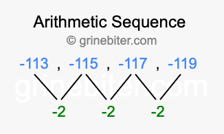 So, what type of sequence is -113, -115, -117, -119? The sequence -113, -115, -117, -119 has a common difference of -2 between each term. We call this kind of sequence an arithmetic sequence. Below is an image illustrating the correlation between the arithmetic sequence -113, -115, -117, -119 and its common difference of -2.