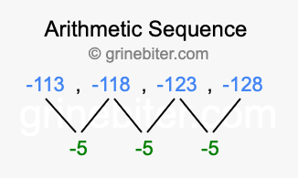 So, what type of sequence is -113, -118, -123, -128? The sequence -113, -118, -123, -128 has a common difference of -5 between each term. We call this kind of sequence an arithmetic sequence. Below is an image illustrating the correlation between the arithmetic sequence -113, -118, -123, -128 and its common difference of -5.