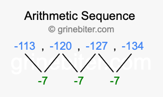 So, what type of sequence is -113, -120, -127, -134? The sequence -113, -120, -127, -134 has a common difference of -7 between each term. We call this kind of sequence an arithmetic sequence. Below is an image illustrating the correlation between the arithmetic sequence -113, -120, -127, -134 and its common difference of -7.