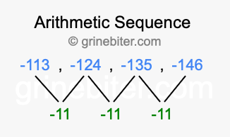 So, what type of sequence is -113, -124, -135, -146? The sequence -113, -124, -135, -146 has a common difference of -11 between each term. We call this kind of sequence an arithmetic sequence. Below is an image illustrating the correlation between the arithmetic sequence -113, -124, -135, -146 and its common difference of -11.