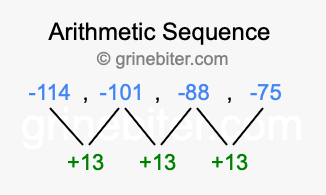 So, what type of sequence is -114, -101, -88, -75? The sequence -114, -101, -88, -75 has a common difference of +13 between each term. We call this kind of sequence an arithmetic sequence. Below is an image illustrating the correlation between the arithmetic sequence -114, -101, -88, -75 and its common difference of +13.
