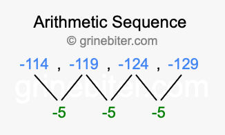 So, what type of sequence is -114, -119, -124, -129? The sequence -114, -119, -124, -129 has a common difference of -5 between each term. We call this kind of sequence an arithmetic sequence. Below is an image illustrating the correlation between the arithmetic sequence -114, -119, -124, -129 and its common difference of -5.