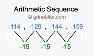 So, what type of sequence is -114, -129, -144, -159? The sequence -114, -129, -144, -159 has a common difference of -15 between each term. We call this kind of sequence an arithmetic sequence. Below is an image illustrating the correlation between the arithmetic sequence -114, -129, -144, -159 and its common difference of -15.