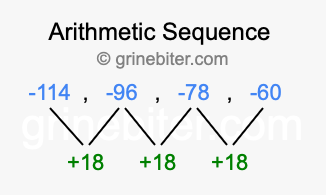 So, what type of sequence is -114, -96, -78, -60? The sequence -114, -96, -78, -60 has a common difference of +18 between each term. We call this kind of sequence an arithmetic sequence. Below is an image illustrating the correlation between the arithmetic sequence -114, -96, -78, -60 and its common difference of +18.
