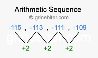 So, what type of sequence is -115, -113, -111, -109? The sequence -115, -113, -111, -109 has a common difference of +2 between each term. We call this kind of sequence an arithmetic sequence. Below is an image illustrating the correlation between the arithmetic sequence -115, -113, -111, -109 and its common difference of +2.