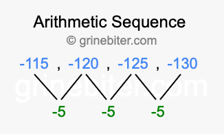 So, what type of sequence is -115, -120, -125, -130? The sequence -115, -120, -125, -130 has a common difference of -5 between each term. We call this kind of sequence an arithmetic sequence. Below is an image illustrating the correlation between the arithmetic sequence -115, -120, -125, -130 and its common difference of -5.