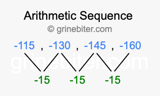 So, what type of sequence is -115, -130, -145, -160? The sequence -115, -130, -145, -160 has a common difference of -15 between each term. We call this kind of sequence an arithmetic sequence. Below is an image illustrating the correlation between the arithmetic sequence -115, -130, -145, -160 and its common difference of -15.