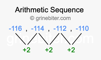 So, what type of sequence is -116, -114, -112, -110? The sequence -116, -114, -112, -110 has a common difference of +2 between each term. We call this kind of sequence an arithmetic sequence. Below is an image illustrating the correlation between the arithmetic sequence -116, -114, -112, -110 and its common difference of +2.