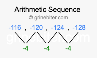 So, what type of sequence is -116, -120, -124, -128? The sequence -116, -120, -124, -128 has a common difference of -4 between each term. We call this kind of sequence an arithmetic sequence. Below is an image illustrating the correlation between the arithmetic sequence -116, -120, -124, -128 and its common difference of -4.