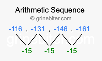 So, what type of sequence is -116, -131, -146, -161? The sequence -116, -131, -146, -161 has a common difference of -15 between each term. We call this kind of sequence an arithmetic sequence. Below is an image illustrating the correlation between the arithmetic sequence -116, -131, -146, -161 and its common difference of -15.